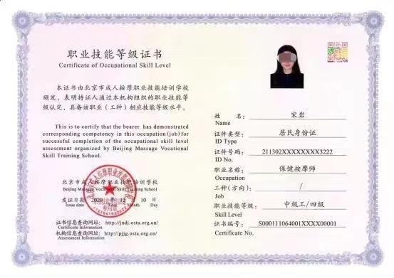 | 證書 | 高級保健按摩師職業技能等級證書 | ||