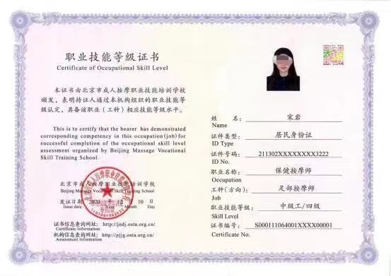 | 證書 | 高級足部按摩師職業技能等級證書 | ||